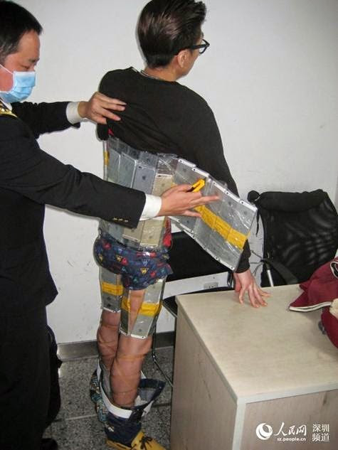 الشاب الصيني كان يقوم بتهريب 94 هاتف ذكي من طراز آيفون 6 و آيفون 6 بلس من الصين إلى مقاطعة " هونك كونغ " من خلال شريط لاصق لفه حول جسده لتبيث هذه الهواتف، حيث بإمكانه بيعها بأثمنة أكثر ارتفاعا في هونك كونغ، لكن أمل الشاب الصيني قد خاب بعد إلقاء القبض عليه من طرف الجمارك و قد بلغت قيمة المحجوزات ما يفوق 64.000 أورو.