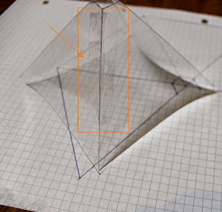 - ضع الورقة من البلاستيك الشفاف فوق الورقة ثبتهما بشريط لاصق ونعيد رسم الشكل الهندسي ل-4 مثلثات على الورق الشفاف ،ثم تقوم بتقطيعه،