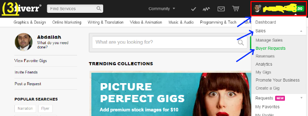 بعد أن تختار المجال الذي تريد العمل فيه، وبعد أن تتسجل بالطبع في الموقع وتملأ بياناتك جيدا، تقوم بإنشاء gig (خدمة)، حيث تقترح العمل الذي ستقوم به مقابل 5$ وذلك عن طريق الضغط على اسمك في أعلى يمين الشاشة، ثم الضغط على Sales ثم Create a GIG ، كما هو مبين في الصورة أسفله:
