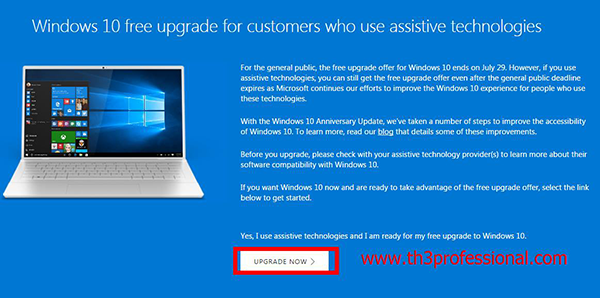كل ما عليك فعله هو توجه الى رابط تجده اسفل تدوينة كالعادة هذه صفحة خصصتها شركة مايكروسفت للأشخاص ذوي الاحتياجات الخاصة او معاقين نسئل الله العافية لجميع إخواننا وأخواتنا بالتالي ويندوز 10 الان غير متوفر للأشخاص الاصحاء مجانا لكنه متوفر للأشخاص ذوى الاحتياجات الخاصة وللحصول عليه يشترط ان تكون تستحدم ويندوز 7 أو ويندوز 8.1 قبل تثبيت ويندوز 10 وحصول عليه بالمجان تضغط على رابط الذي ياخذك الى صفحة التالية وتضغط على UPGRADE NOW