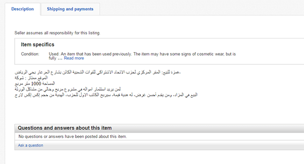 وقم بدأ المزاد بملغ لا يقل عن 2000 دولار قبل يومي ، وحصل الى حدود كتابة هذا التدوينة 10 الف دولار . وكتب البائع عن هذا العرضه انه "لمن يريد استثمار امواله في مشروع مربح وخالي من مشاكل الورثة .البيع في المزاد، ومن يقدام أحسن عرض، له هدية قيمة، سيربح الكاتب الاول للحزب، الهدية من حجم إكس إكس لارج"